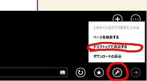 Windowsのスタート画面からInternet Explorerを起動し、「ページツール」で表示されるメニューから「デスクトップで表示する」をクリック。